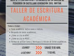 El área de literatura UFRO y los/as estudiantes de la carrera de Pedagogía en Castellano generación 2019, tienen el agrado de invitarle al “Taller de Escritura Académica”. Actividad a desarrollarse… Read more »
